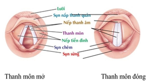 Đưa lưỡi đèn vào khoang miệng → quan sát dây thanh âm