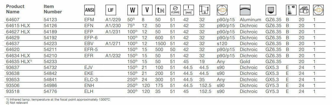 1 | BÓNG ĐÈN OSRAM 64653 | Công suất: 250W. Điện áp: 24V Tuổi thọ: 50 h Nhiệt độ màu: 3000K. Loai đuôi bóng: GX5.3. |