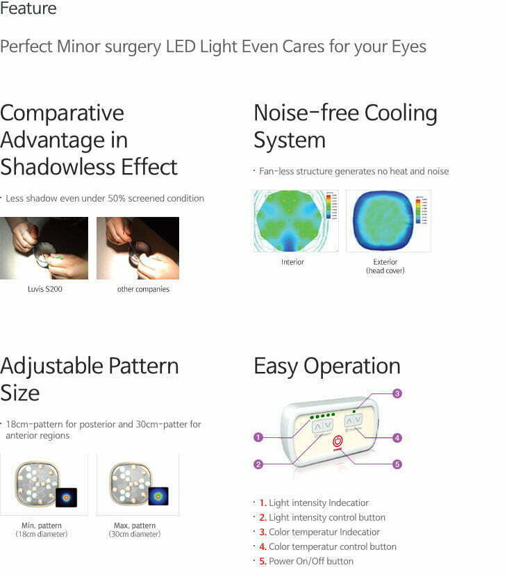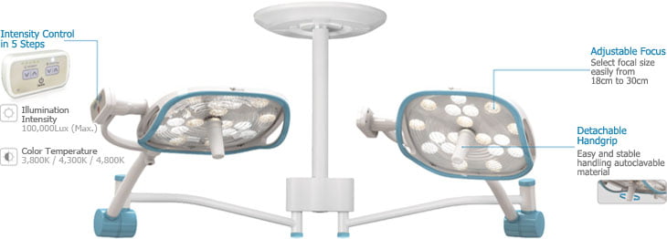 – Đèn mổ treo trần sử dụng ánh sáng đồng nhất, tập trung vào khu phẫu thuật và có độ sâu nhờ vào ưu điểm của bóng LED