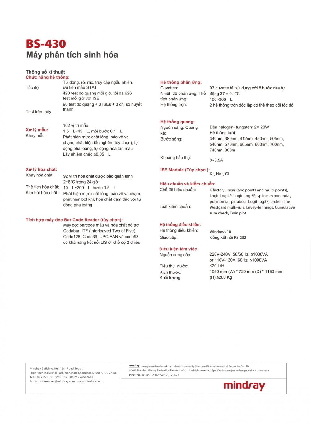 Thông số kỹ thuật của máy sinh hóa Bs 430